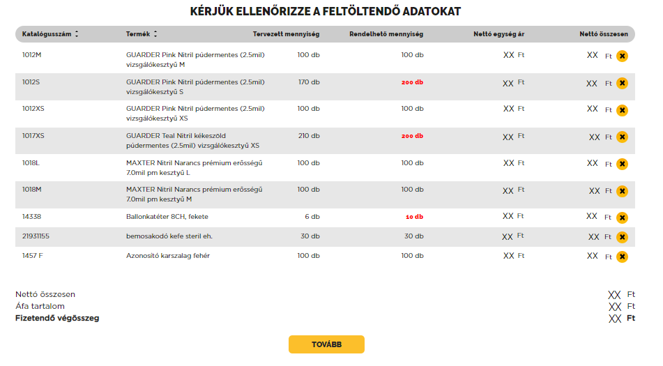 4.) Ezt követően a tovább gombra kell kattintani, itt látható, hogy rendszerünk automatikusan a kiszereléshez igazította a rendelni kívánt mennyiséget, mely a megrendelés felületen még igény szerint módosítható, törölhető.