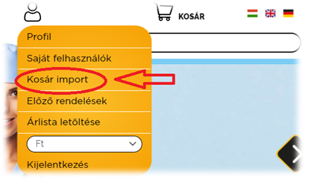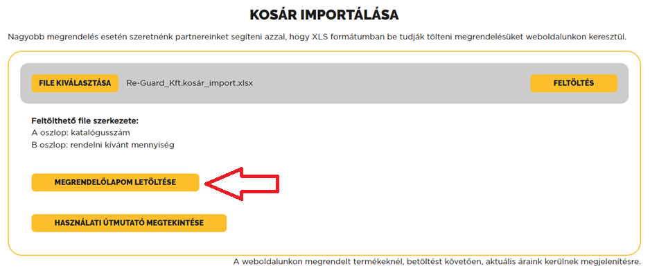 2.) Bejelentkezést követően, a kosár importra kattintva, lehetőség van XLS formátumot betölteni a megadott szempontok alapján: