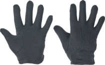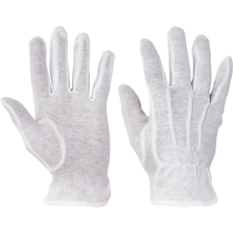 Kötött pamutkelméből varrt, mandzsetta nélküli kesztyű PVC-vel pontozott tenyérrel és ujjakkal, valamint rugalmas szalaggal a csukló felső részén.