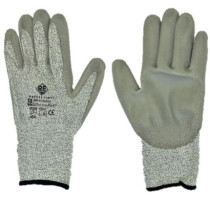Schnittfester Handschuh mit fünf Fingern, in grauem Polyurethan getaucht auf der Handfläche.