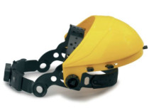 Hochklappbarer Stirnschutz mit 3 Positionen, Ratscheneinstellung, gelber Stirnschutz aus Polypropylen, Schweißabsorber auf der Stirn.