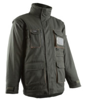Robuste, wärmeisolierte Arbeitsjacke mit abnehmbaren Ärmeln und Kapuze, ideal für kalte Arbeitsumgebungen.