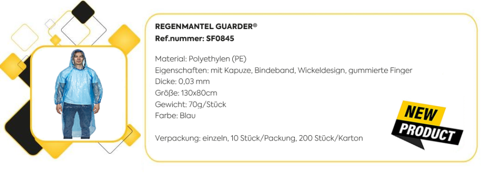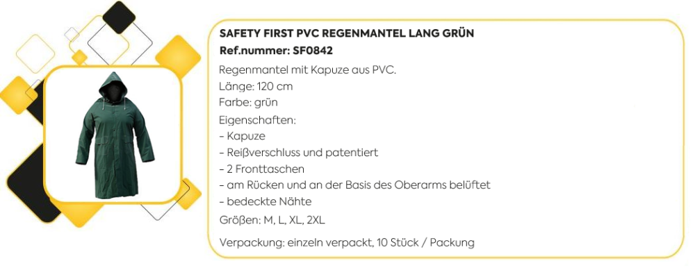 Regenmantel mit Kapuze aus PVC. Länge: 120 cm Farbe: grün Eigenschaften: - Kapuze - Reißverschluss und patentiert - 2 Fronttaschen - am Rücken und an der Basis des Oberarms belüftet - bedeckte Nähte Größen: M, L, XL, 2XL Verpackung: einzeln verpackt, 10 Stück / Packung