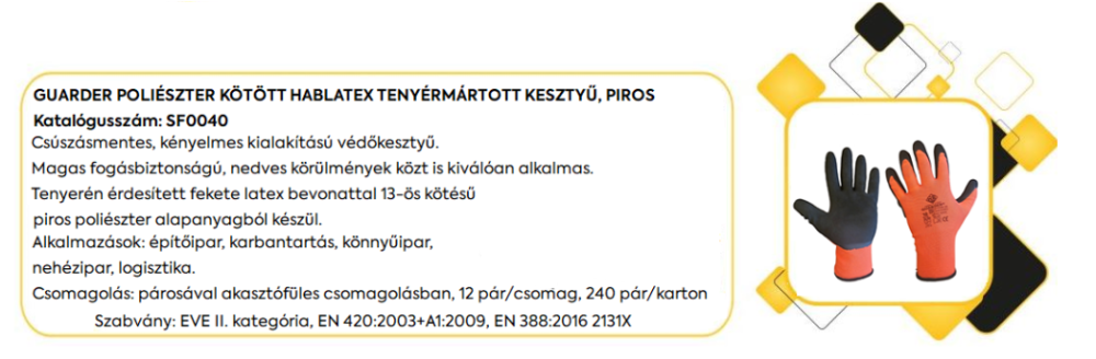 Csúszásmentes, kényelmes kialakítású védőkesztyű. Magas fogásbiztonságú, nedves körülmények közt is kiválóan alkalmas. Tenyerén érdesített fekete latex bevonattal 13-ös kötésű piros poliészter alapanyagból készül. Alkalmazások: építőipar, karbantartás, könnyűipar, nehézipar, logisztika. Csomagolás: párosával akasztófüles csomagolásban, 12 pár/csomag, 240 pár/karton EU szabvány: EN 420:2003; EN 388:2016 2131X
