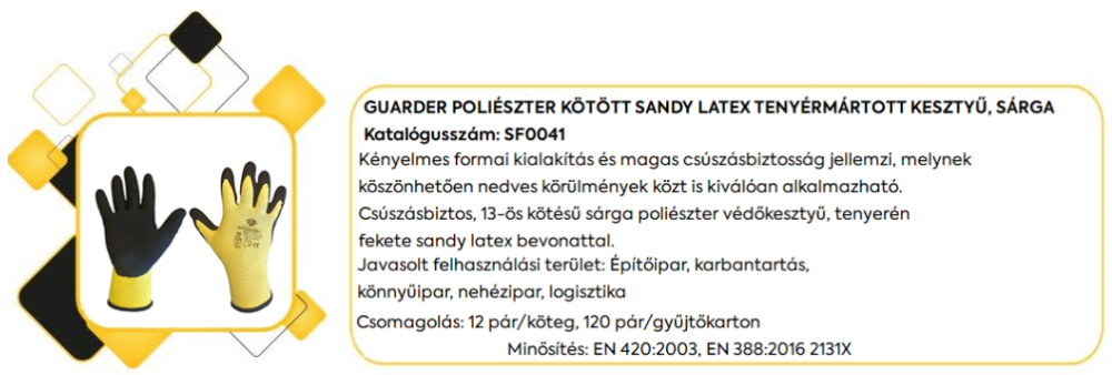 Kényelmes formai kialakítás és magas csúszásbiztosság jellemzi, melynek köszönhetően nedves körülmények közt is kiválóan alkalmazható. Csúszásbiztos, 13-ös kötésű sárga poliészter védőkesztyű, tenyerén fekete sandy latex bevonattal. Javasolt felhasználási terület: Építőipar, karbantartás, könnyűipar, nehézipar, logisztika Csomagolás: 12 pár/köteg, 120 pár/gyűjtőkarton EU szabvány: EN 420:2003; EN 388:2016 2131X