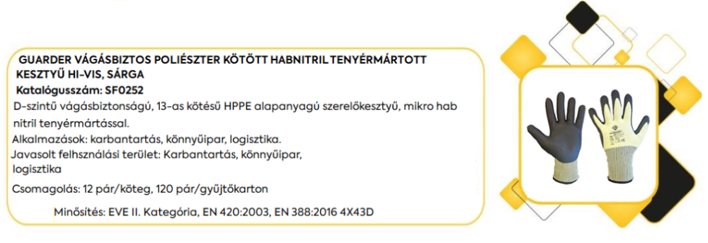Guarder Vágásbiztos poliészter kötött habnitril tenyérmártott kesztyű HI-VIS: magas vágásbiztosságú kesztyű, amely különösen ajánlott metszési és egyéb éles eszközökkel végzett munkákhoz.